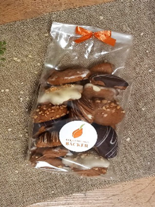 Zutaten: *Dinkelmehl, *Bienenhonig, *Roggenmehl, *Eier, *DinkelKeimlinge, *Agavensirup, *Bitterschokoladenkuvertüre, weiße Kuvertüre, *Mandeln, *Lebkuchengewürz, *Natron
